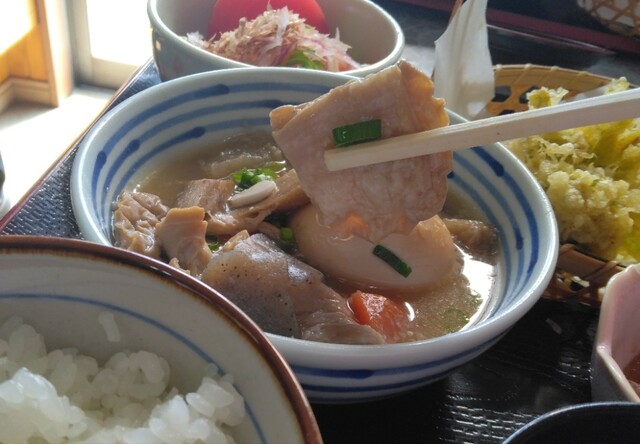 大きなお盆の上 左側 サラダ、もつ煮、季節の天ぷら♬