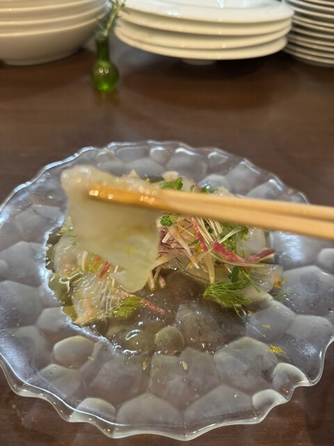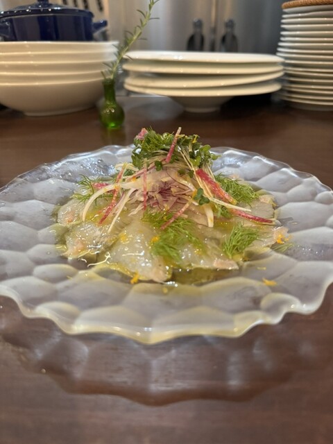 鮮魚のカルパッチョはこの日は天然の平目を1週間熟成させたもの。