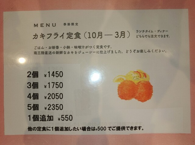私はお一人様のため壁に向かった2人掛けのテーブルへ案内され、直ぐ様カキフライ定食(3個入り)をオーダー。あまりにも直ぐオーダーしたため店員さん(奥様?)が、えっ?と困惑するくらいの早さ。