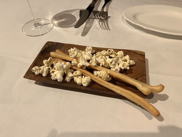 ほかほかのポップコーン。国産で甘くておいしい。前菜の生ハムが待ちきれずグリッシーニも食べてしまった。