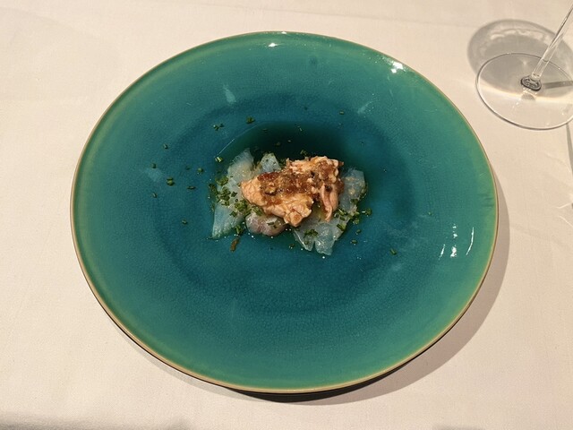 瀬戸内海のカワハギのカルパッチョ。新鮮な肝と柑橘のドレッシングがまじでうまい。