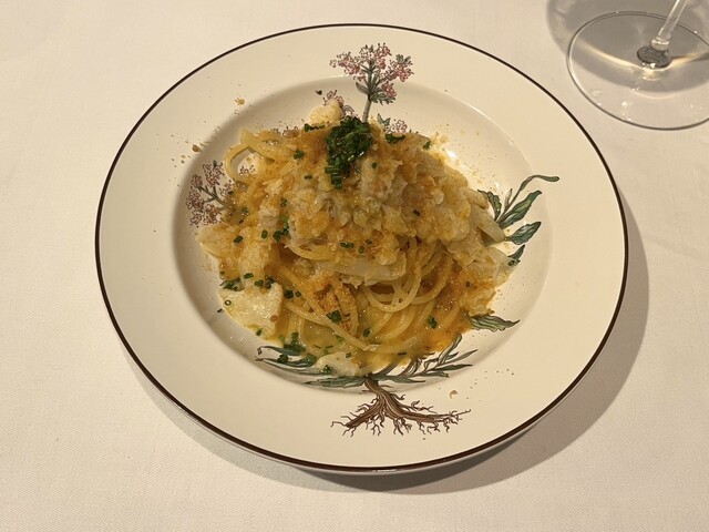 カラスミと蟹のペペロンチーノ。麺がもちもちでとてもおいしい。