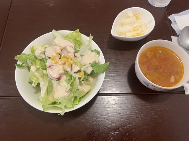 ランチセットは、メインに、サラダとスープと、食後のコーヒーまでついてこの値段。
