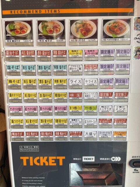 店入口ドア近くの券売機、初訪店の場合は必ず一番左上のメニューをチョイス。半ライスもボタンをプッシュ。