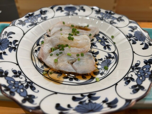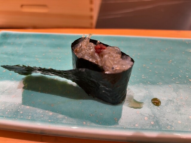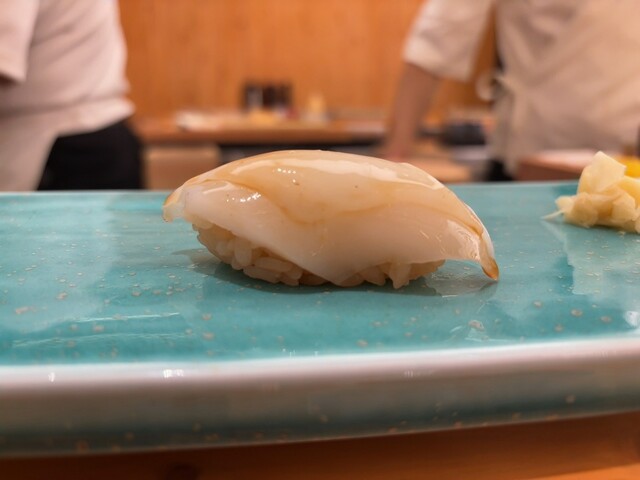 初っ端、ホタテを半ナマに揚げた手巻き寿司を渡される。お寿司は熟成ネタが多く、ノドグロが印象的だった。