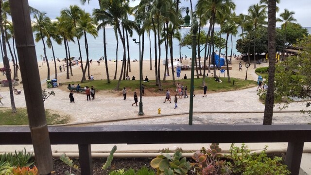 高級ホテルのテラスからワイキキのビーチと日の入り、果てのない水平線を眺めながら優雅な気持ちで夕食をいただく。