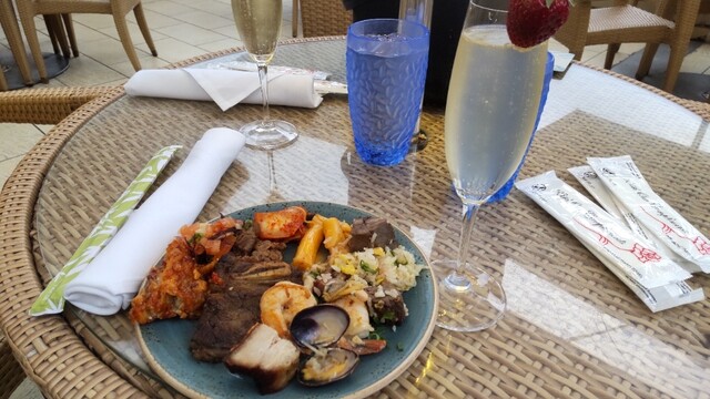 骨付きカルビにローストビーフ、プルドポーク等の肉メニューを皿いっぱいに取りつつ、チャーハンやジャパニーズ・スシ(鮪と海老とカリフォルニアロール、味は推して知るべし笑)等のご飯ものと一緒にガッツリいただく。