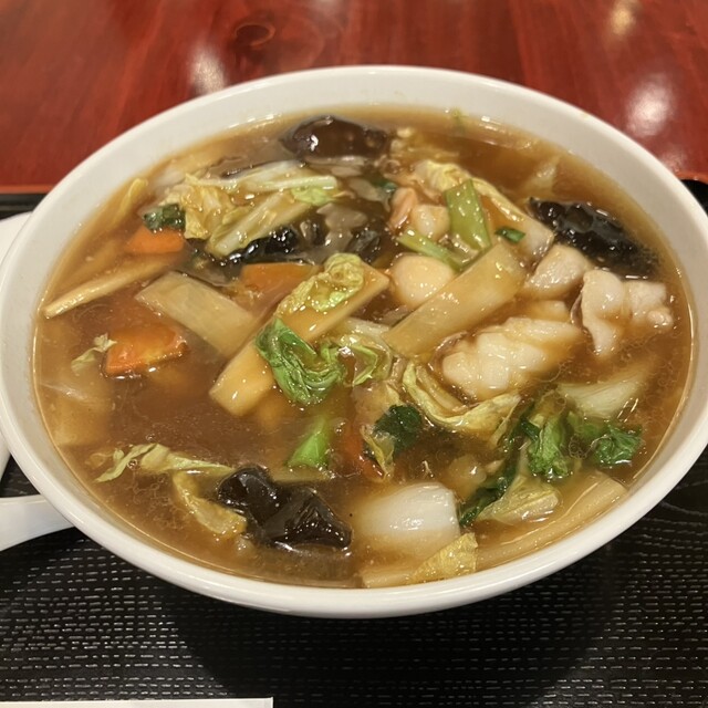 この五目あんかけ麺は、野菜やキクラゲ、エビ、豚肉、たけのこなど具材が本当に豊富で、彩りもよく最後まで飽きずに食べられます。とろみのある醤油味のあんが麺によく絡み、安定感のある美味しさです。