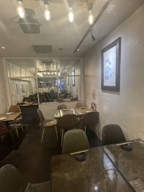 学芸大学東口から徒歩2分にあるモダン酒場に来店。日曜に利用。店内はカウンターとテーブル席がある。なんと、入った瞬間から美術館?と思う装飾が沢山あった。壁に絵がかけられているのだがお花の絵がまるで美術館にも展示されているようなものばかり。