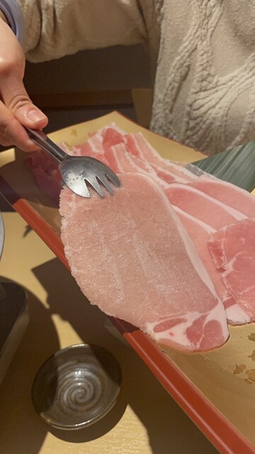 新潟のブランド豚「越後もち豚」を使用。バラとロースの2種類で、どちらもツヤツヤと美しい。出汁にさっとくぐらせると甘みが引き立ち、そのままでも十分おいしい。お好みでブラックペッパーを加えると味が締まって、また違った表情に。野菜もたっぷりでバランス◎