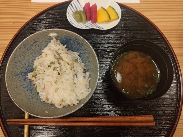 〆の土鍋ご飯はシラスと茗荷。茗荷シャキシャキでさっぱり、ご飯もふっくらでとても美味しかったです。