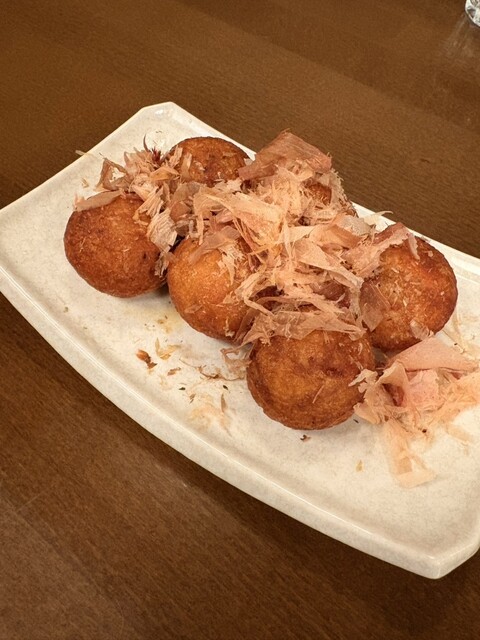 たこ焼きは、外はカリッと香ばしく、中はとろっとした理想的な食感。焼き加減が絶妙で、噛んだ瞬間に広がる生地の旨みとタコの歯ごたえがたまらない。ソースとのバランスも良く、ついつい手が止まらなくなる美味しさ。