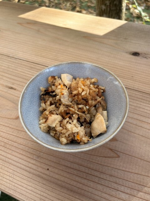 この日いただいたのは、日替りランチだという 山芋・ナス・さつまいも・サーモンの天ぷら盛り合わせ、炊き込みご飯。外にあるテラス席にご案内いただきました。