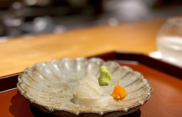 ノドグロ。 少し残念だった白甘鯛を見返すような素晴らしいノドグロでした。 炙り香、温度、皮目の食感、身の旨味、上品な脂。 この1切れで、多層的、重層的に口の中は幸せで満たされました。 お刺し身オールスターズのトリを担うに十分な存在感。 おかわり欲しかった・・