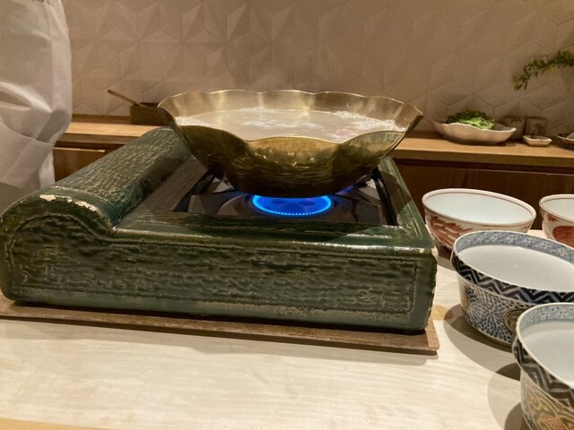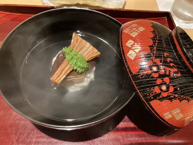 目の前で削る氷鉢は美しく、煮鮑、葛切り、出汁です。煮鮑は噛めば噛むほど旨味が出て、葛切りのツルっと感に優しい冷たい出汁が暑い夏にピッタリな一品です。