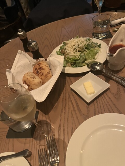 シーザーサラダ、ジャーマンポテト、steak for 2を頼んで2人でちょうど良いくらいでした。帰りにTボーンを持ち帰ることができ、家で牛骨スープを楽しみました。