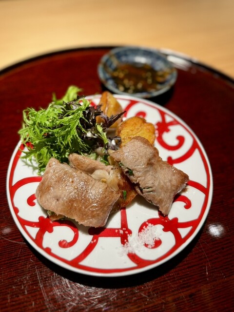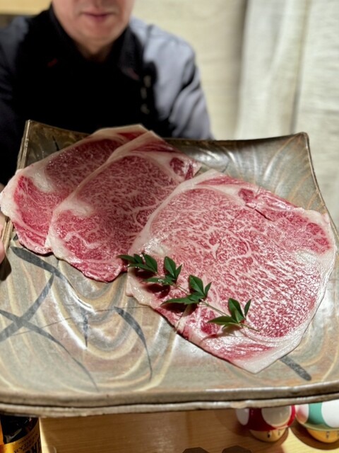 サーロイン薄焼きは焼く前のお肉も見せてもらえます!完成したお肉の中にはネギとニンニクが入っていてとっても美味✨ソースを付けて食べるのも良いですがそのままでも十分美味しいです!