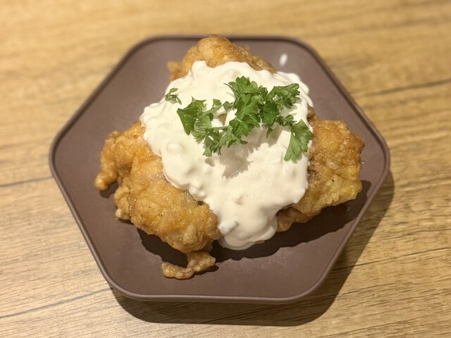 大きめの唐揚げにあまじょっぱいタレと自家製のタルタルソースが美味しい✨満足感ある一品