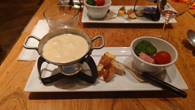 銀座の夜景を見ながらのチーズ尽くし、フォンデュは小さなフォンデュ皿が用意され各自で楽しめます。