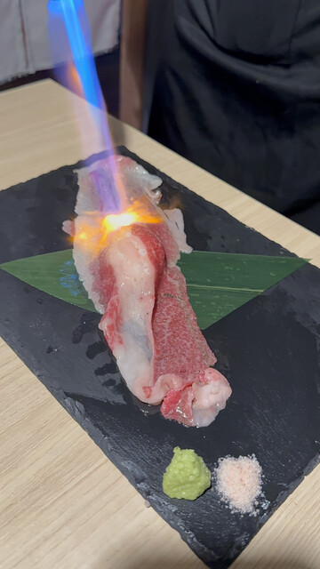 “ブリスケ”=ぶりのスネや肩あたりの部位?肉寿司形式で“寿司”+“ブリスケ”+“大判”。
