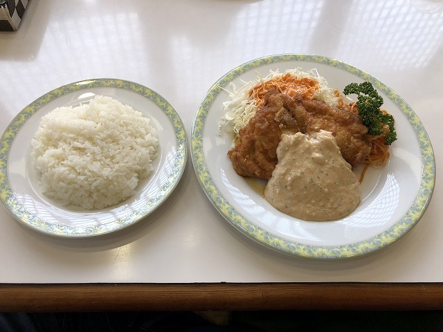 (チキン南蛮にライス並・キャベツのサラダ・スパゲティがセットで付いてます)