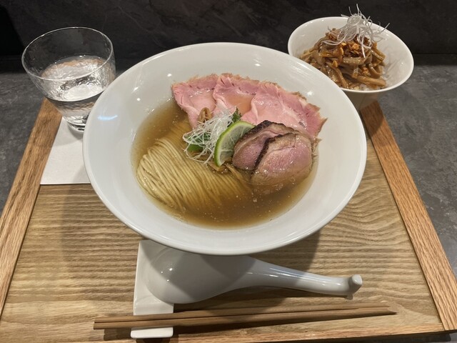 豚チャーシュー ×3枚、鴨ロース ×2枚 メンマ、小松菜、白髪ねぎ、刻み玉ねぎ