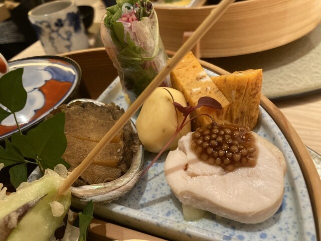 こちらでは、月曜日から土曜日のランチ時に『あんず膳』という限定があり、コスパが崩壊しているランチを頂けます。内容が豪華で、ヒレカツに宮崎牛とトリュフのコロッケ、宮崎牛の煮付け、飾り包丁も美しい野菜の煮物に、野菜の天ぷら、生春巻きに出し巻き卵、鶏肉のハニーマスタードソース、ラフランス添え、銀杏などの入った茶碗蒸しに、煮鮑、舞茸の炊き込みご飯、味噌汁と付いて、なんと税込1,650円!