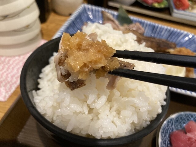 店内奥の2名テーブルで冷たいお茶をいただいていると10分強で配膳。ご飯大盛りでお願いしたのですが、まさかの漫画盛り!冷汗タラリ・・・ 母のアジフライは2尾つけられた上に、大きな骨煎餅まで乗せられボリューム満点。私の本鮪アゴ炭火焼も大ぶりなもので、大萌乃大根おろしがニクイ!小皿のマグロ切り落としも新鮮そのもの。味噌汁を一口いって、いただきます!
