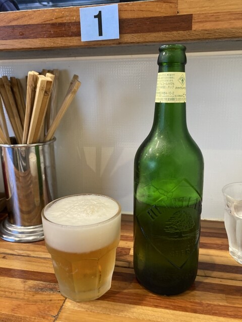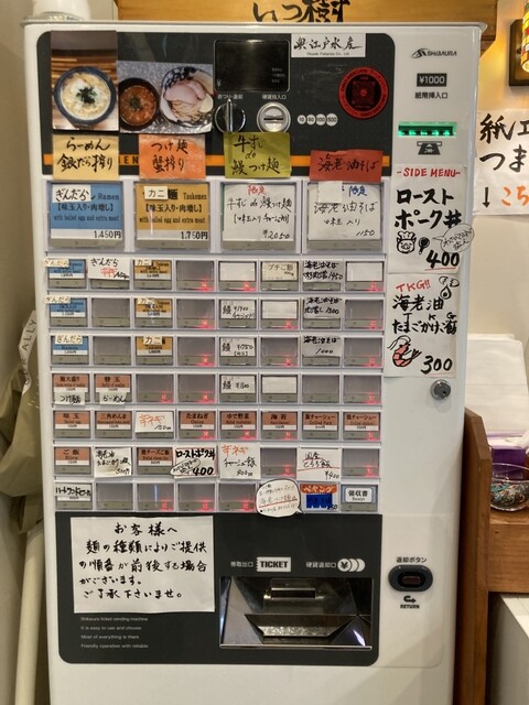 こちらは食券制で、その脇のテーブルにお冷やや紙エプロン、髪留めゴムに味変アイテム等が置かれています。また、店内ストッカーの上にはポットの出汁割りが置いてありセルフとなっており、初めての際には気がつきずらいかなとも思いました。