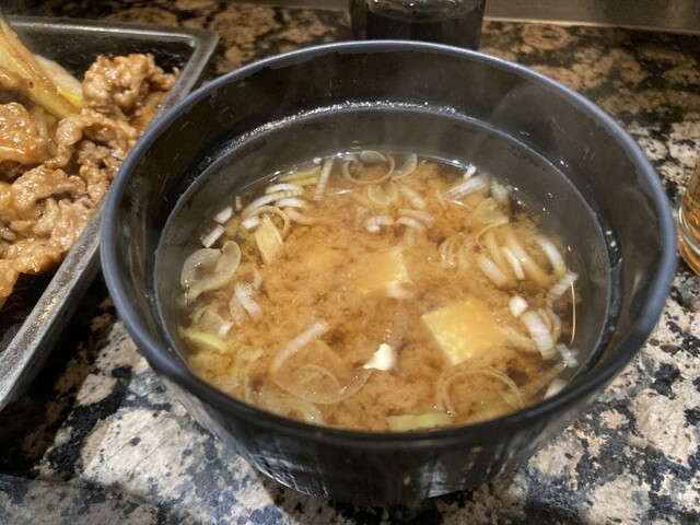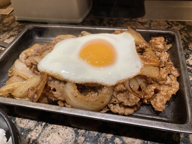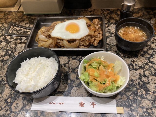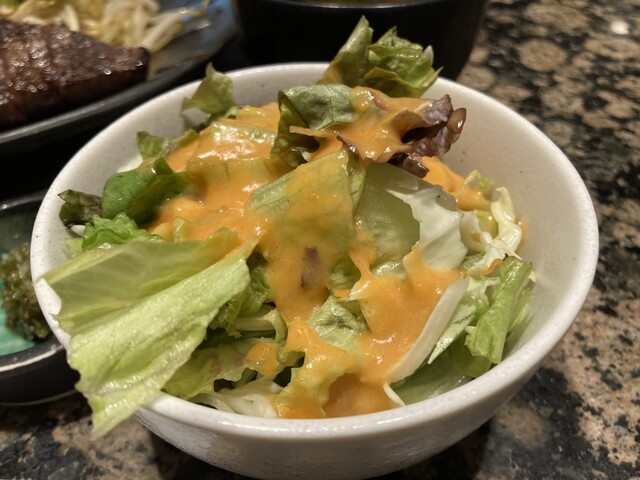 そして配膳。心を込めていただきます!まずは自家製ドレッシングの美味しいサラダから。胃が刺激され、堪らなくなったところで玉ねぎと牛バラをハムり!特製ソースのフルーティーな香りと味噌と思われる隠し味のアクセントが最高で、口中で旨みが爆発!ご飯が止まりません。なんだろう、この美味さ。この前のサービスステーキは確かに美味しかったのだけれど、もっとプリミティブな美味さにご飯が枯渇。半ライスをお願いしました♪しかし、このおいしさはなんだろうと感じつつ箸を進めればあっという間に完食!ご馳走さまでした♪