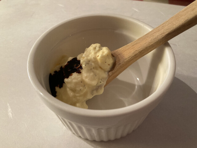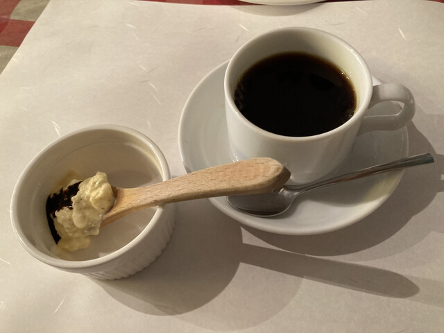 その後、メインが到着。真鱈は大きく皮目のパリッと感が素晴らしい。豚挽肉とマッシュポテトのオーブン焼きは下に敷かれたソースとの色彩が美しい。メインと共にバケットかライスか選べますが、本日はライスでお願いしました。豚挽肉は旨みがしっかりしており、ソースとの相性も良くマッシュポテトの滑らかさも相まり口に楽しい。真鱈も少し頂きましたが、皮目に比して身の火入れは程よくジューシーな仕上がり。付け合わせも素材の味を殺さぬ味付けで良い箸休め。総じて仕事の丁寧さが感じられるお食事でした。食後の一口プリンサービスも素晴らしく、カラメルのほろ苦さが大人味で、コーヒーも大変美味しく頂きました。ご馳走さまでした♪