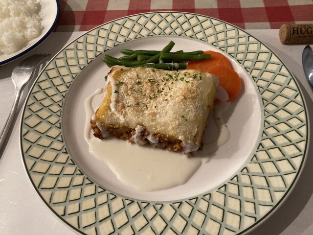 ランチは魚と肉の2種類で、日替わりとなっているよう。今日は魚が真鱈のソテー、肉が豚挽肉とマッシュポテトのオーブン焼きで、母が魚、私が肉でお願いしました。