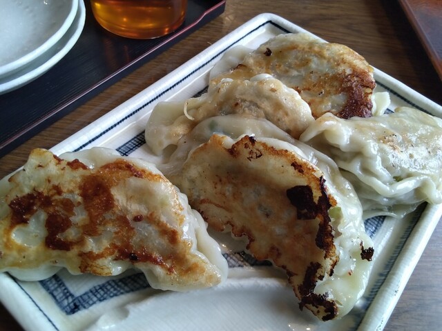 扉を開けて中へと入ります。右奥が厨房、左手にテーブル席が並んでいます。テーブル席の一卓へ、注文は私Aセット(ハンバーグとジャンボエビフライ)娘Bセット(ハンバーグとカニクリームコロッケ)これにライス又はパンとスープが付いてきます。これだけでも良かったのですが、黒板のおつまみメニューの中に「マスター手作りぎょうざ」なんてのを見つけてしまいました。これは餃子好きはイキますね。洋食屋さんの餃子にも興味津々ですし、何より誰もレビューしてないだろうと思ったら、さすがビーグルさんが「チュルッと旨い餃子」なんて書いていました。少し時間をかけて到着です。餃子は注文を受けてから皮から手作りとさらにユックリと........でもこの餃子、盛り付け、焼き目は家庭の餃子だけど、食べたらウンマイ♪頼んでみて大正解。ハンバーグとエビフライはもう言うまでもなく、正統派洋食屋さんの味。カニクリームコロッケも幸せそうに食べていました。土浦の洋食屋さん40年くらい前に競うようにオープンして愛されてきたのだなあと思いながらご馳走様でした。次回は、こちらの一押しローズポークをいただきましょう。ンっもしかして餃子の中身.......