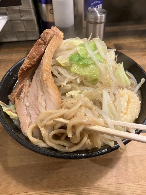 こちらは完全な二郎系ですが、あえて腹八分目で食べたかったので、麺は少なめの150g、野菜増しは無しの通常メニューで味わいました~ヽ(^。^)ノ