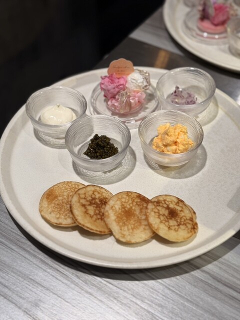 コースはいきなりプレミアムオシェトラキャビアと焼き上げたブリニーからスタート