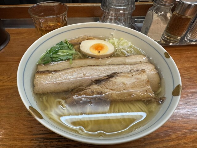 澄んだスープ、やわらかく煮込まれた焼豚、お口スッキリの葉っぱ、お茶も美味しいね。