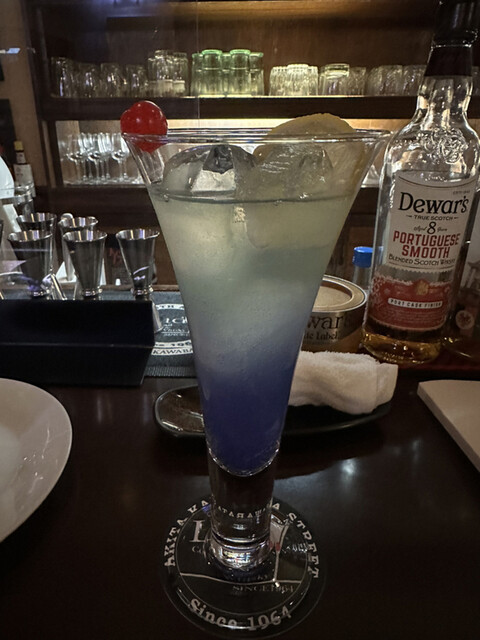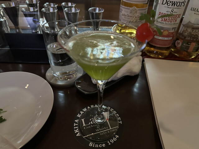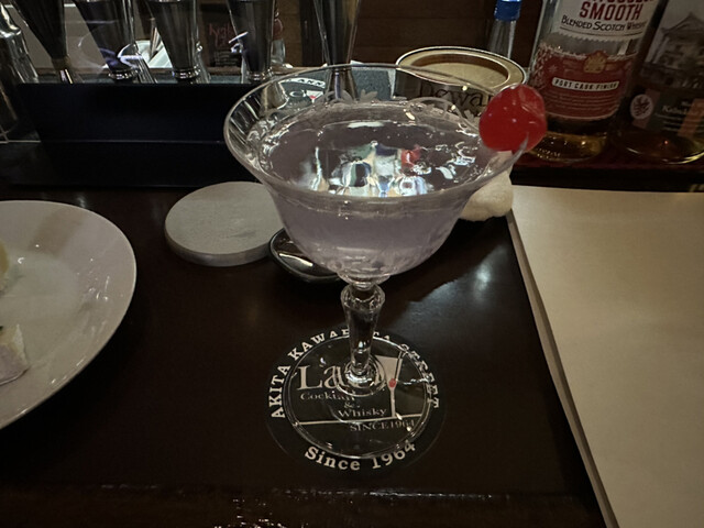 この日はボックス席が埋まるほど客入りが激しく、マスターも忙しく動いていた。少しタイムラグを挟んで、オリジナルカクテルの千秋神楽。スーパーニッカをベースに、プルシア(プラムリキュール)、アマレット(アーモンドリキュール)、ブルーキュラソー。プラムの爽やかな甘みが主体であり、その他素材が作品全体を円やかにする。