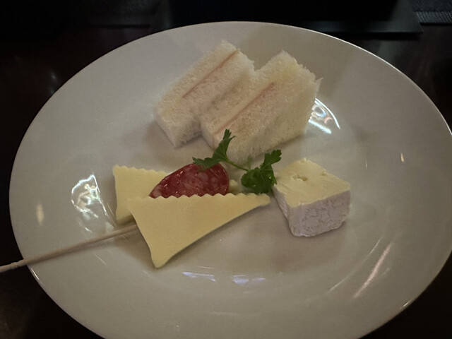 カクテルの前にお通しを。チーズ2種、サラミ、そして前回印象に残ったハムサンドも健在。今回はしっかり酔っていたためあまり深くテイスティングできていないが、酔い止めがてら追加発注してまで夢中でハムサンドを頬張る。