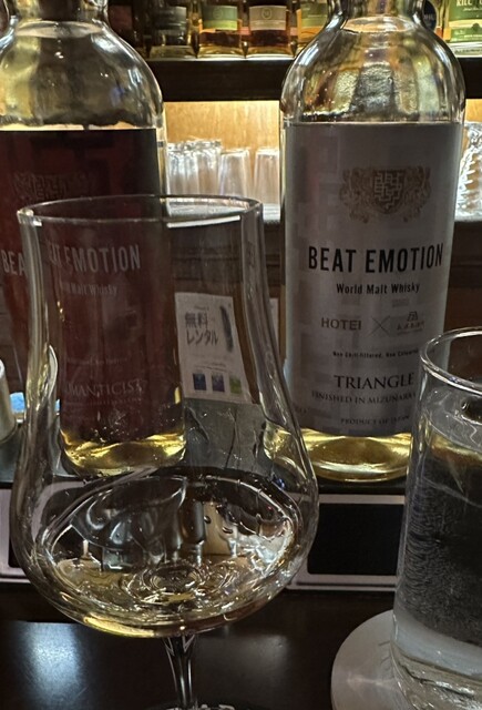 続いては、長濱蒸溜所とあの布袋寅泰がコラボした。BEAT EMOTION triangle。長濱のミズナラ樽、スコットランドのモルト、群馬の水のトライアングル。ピートの奥にバナナやらの優しく濃いフルーティな味わいがあり心に響く。