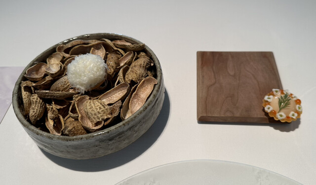 続いてフィンガーフードが2種類登場する。落花生の殻の中に埋もれたピーナッツタルト。那須産チーズ「みのり」が削られているが、やはりピーナッツのコクが印象的である。少し黒胡椒らしきものが効いているのも良い。