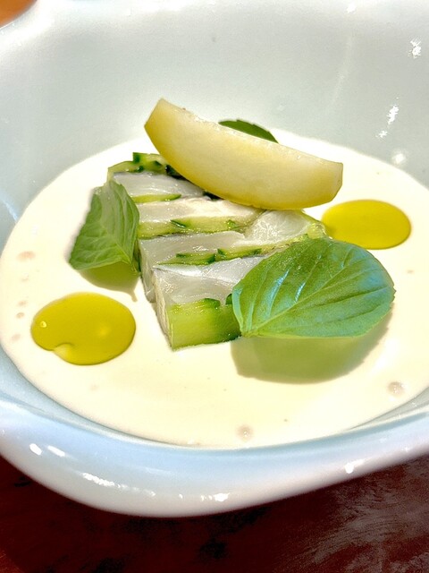 ココナッツミルクのスープとヒラスズキのテリーヌを一口食べた瞬間来てよかった〜と思った!