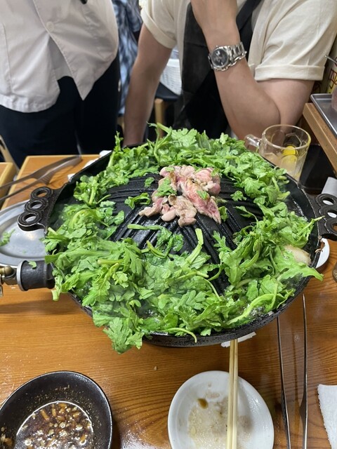 大量の春菊!とハンバーグのようなラム肉を、軽く火を入れて完成。