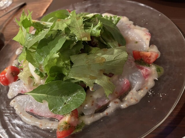 沼津港の鯛のカルパッチョ。白ワイン泥棒。