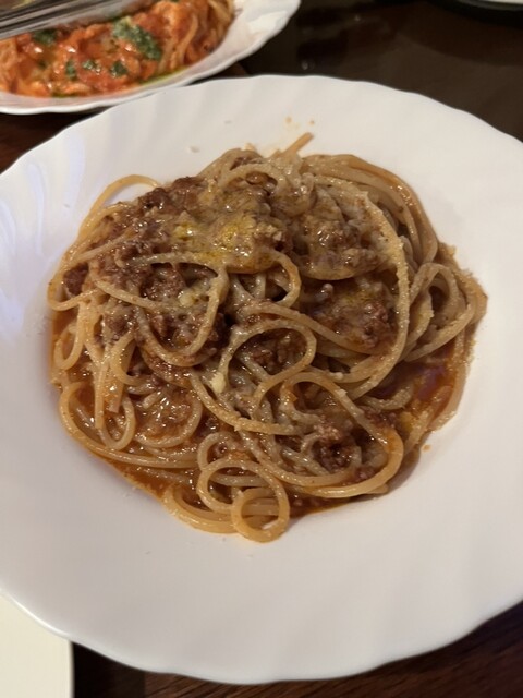 以前から気になっていたオードブルの盛り合わせでスタート。定番の野菜、サーモン、海老のテリーヌ、トリッパ、鴨のロースト、桜エビのトマトクリームパスタに加えて、ポークバラ肉の煮込み、ミートソースパスタもオーダーしてシェアしました。オードブルは6種類の前菜がバランスよく盛り付けられてどれも美味しかったです。中でも紫キャベツのピクルスは程よい酸味にクミンが効いてセンスの良さを感じました。初挑戦のミートソースはしっかり肉感残ったボロネーゼで大好きな味です。ポーク煮込みは、サッパリした洋風の豚の角煮でバターライスが添えられてボリューム満点の一皿です。