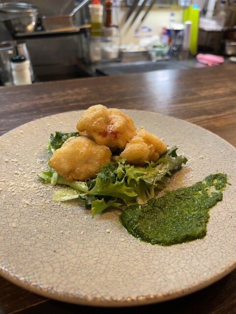 蓮根の唐揚げもチーズがたっぷりかかっていてワインが進みます。