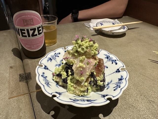 白身魚の刺身に、鮮やかな緑色のアボカドペーストまたはワサビソース、海苔、ピンクの花びら(食用花)を組み合わせた創作料理。伝統的な和食の技法に現代的なプレゼンテーションを融合させた意欲作です。白地に藍色の模様が入った古伊万里風の器も料理を引き立てています。