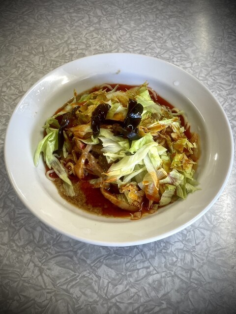 五目冷し中華…冷たく締められたコシの有る中太麺と甘みを含んだ醤油ダレの組み合わせで赤耳チャーシューが2枚載っていたりと豪華な仕様