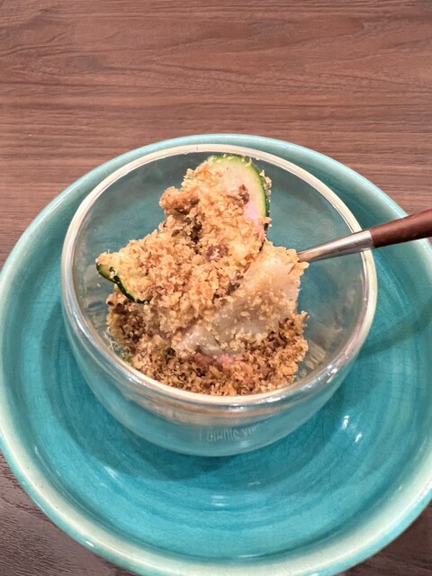 酸味のあるビーツと肉厚なホタテをパン粉?のようなサクサクした生地と一緒にサラダ仕立てで食べる一品!新食感で次の料理の期待感も高まります。