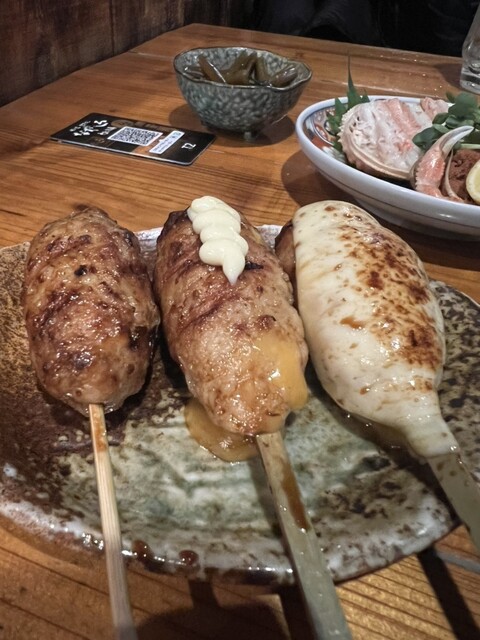 これは単品ですけど、勝手に盛り合わせにしました☆チーズつくね?つくねチーズ、発祥の地だけあってめちゃくちゃ美味しい!チーズがめっちゃたっぷりでチーズ好きにはたまらん。(ちなみに実はつくねあんまり好きじゃないです。でもここのはめっちゃ好き)