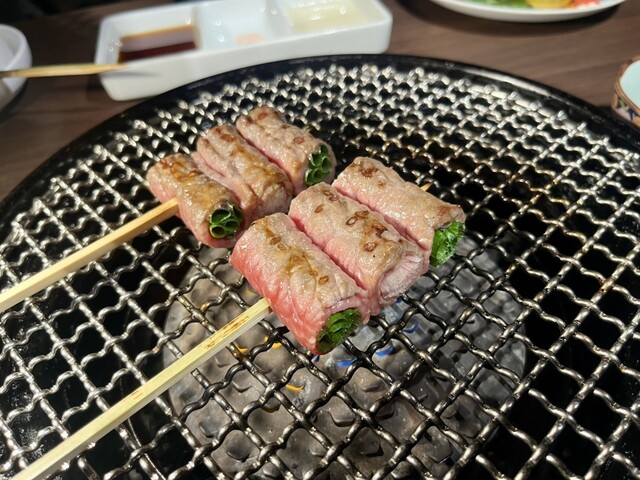 赤身肉を青ネギと白ネギで巻いた串は、焼きながらハケで醤油を塗り仕上げていくスタイル。